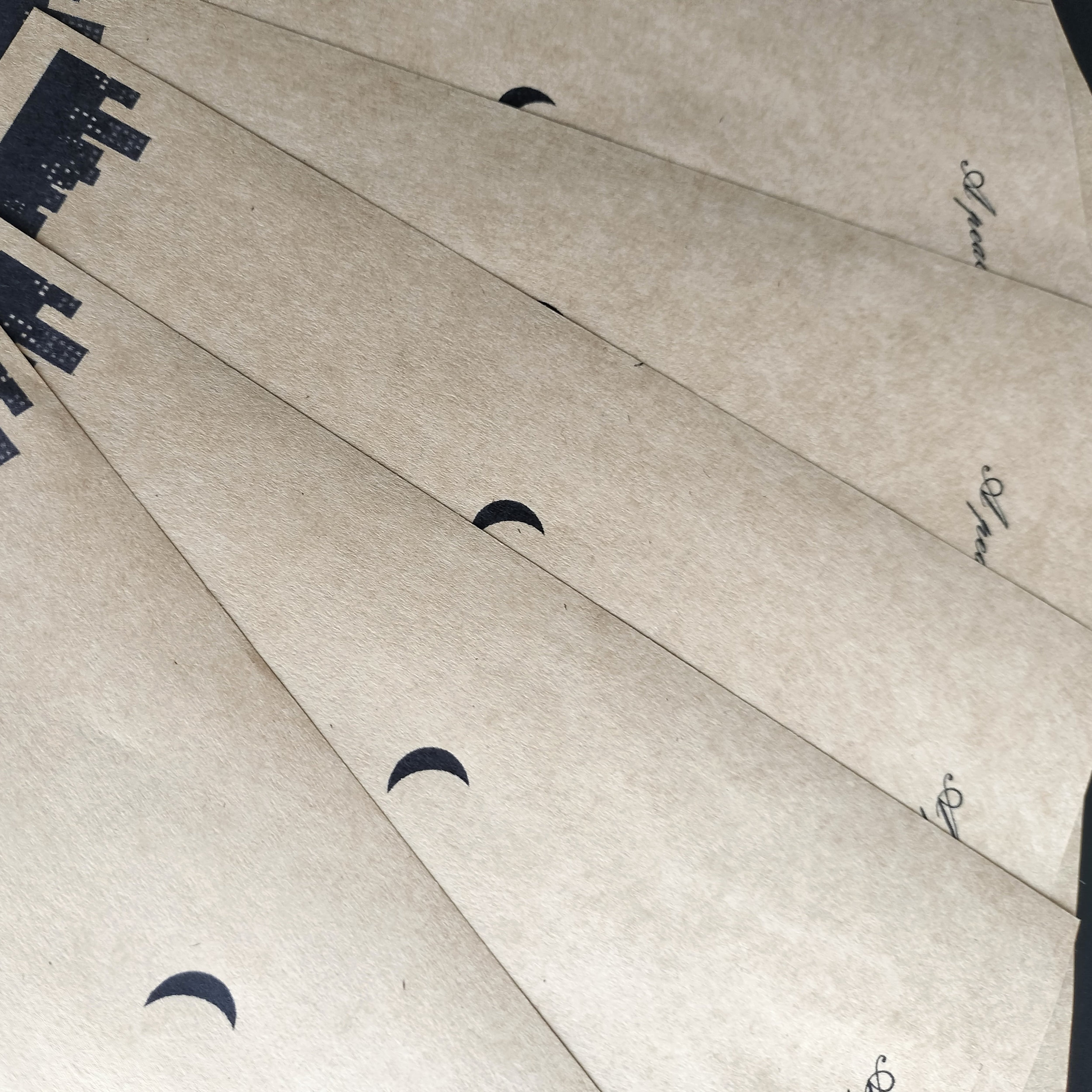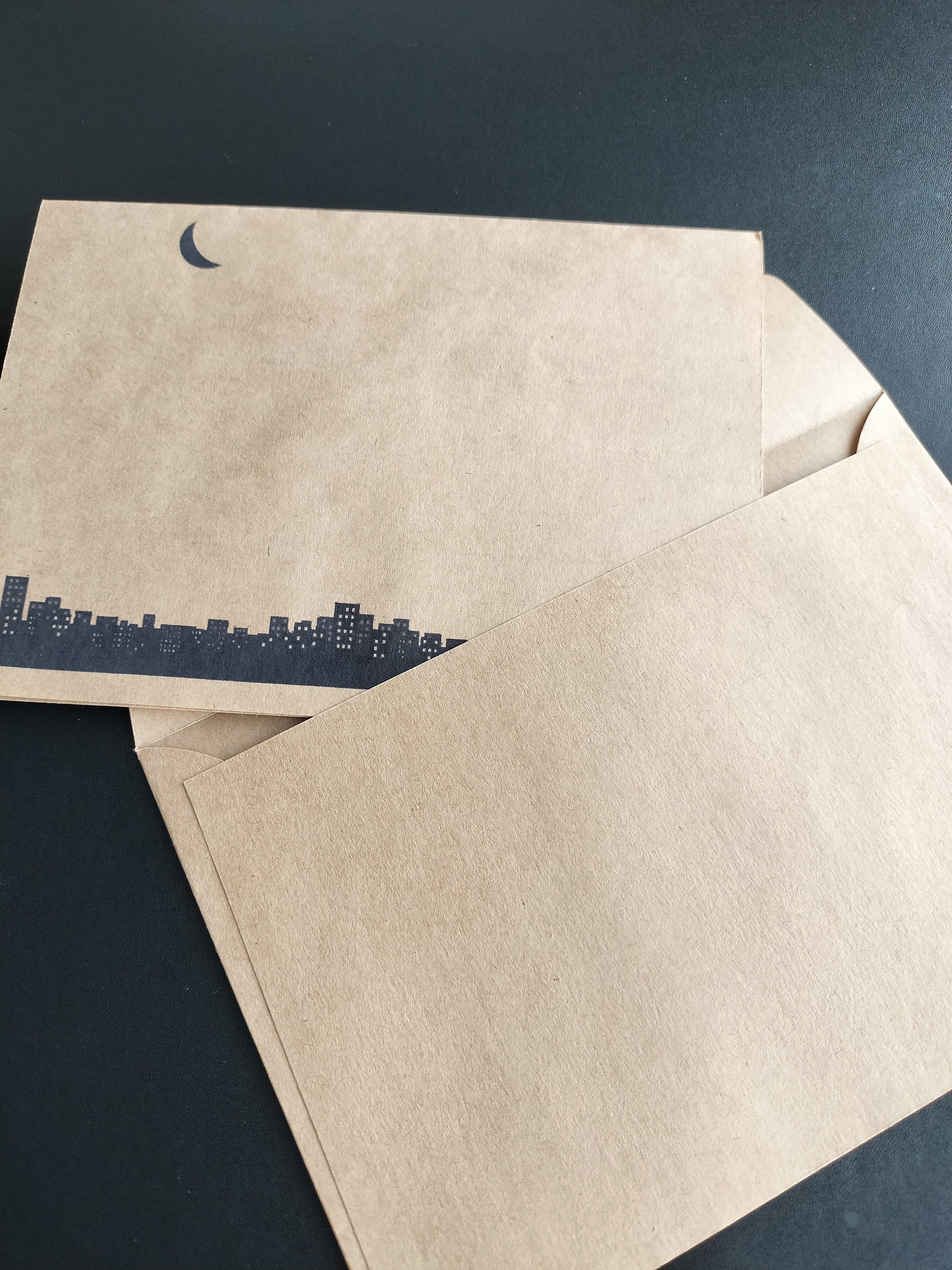 夜の街をイメージした、よるまちレターセットは、受け取った人が穏やかで幸せな夜を過ごせるように、との思いをデザインに込めました。便箋の上部にはタイトルが、下部には月や建物のシルエットが描かれており、まるで夜の街を散歩しているかのような気分にさせてくれます。