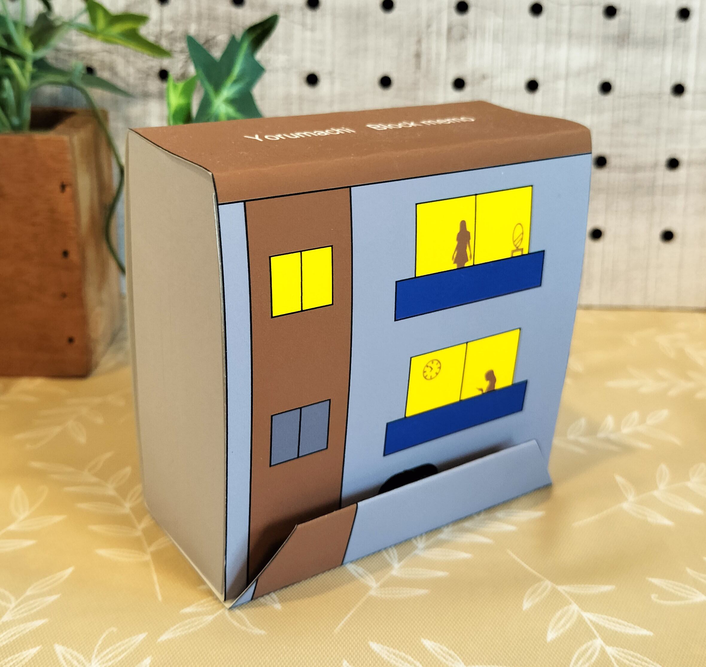 夜のアパートと、そこの住人たちのシルエットがデザインされたブロックメモです。