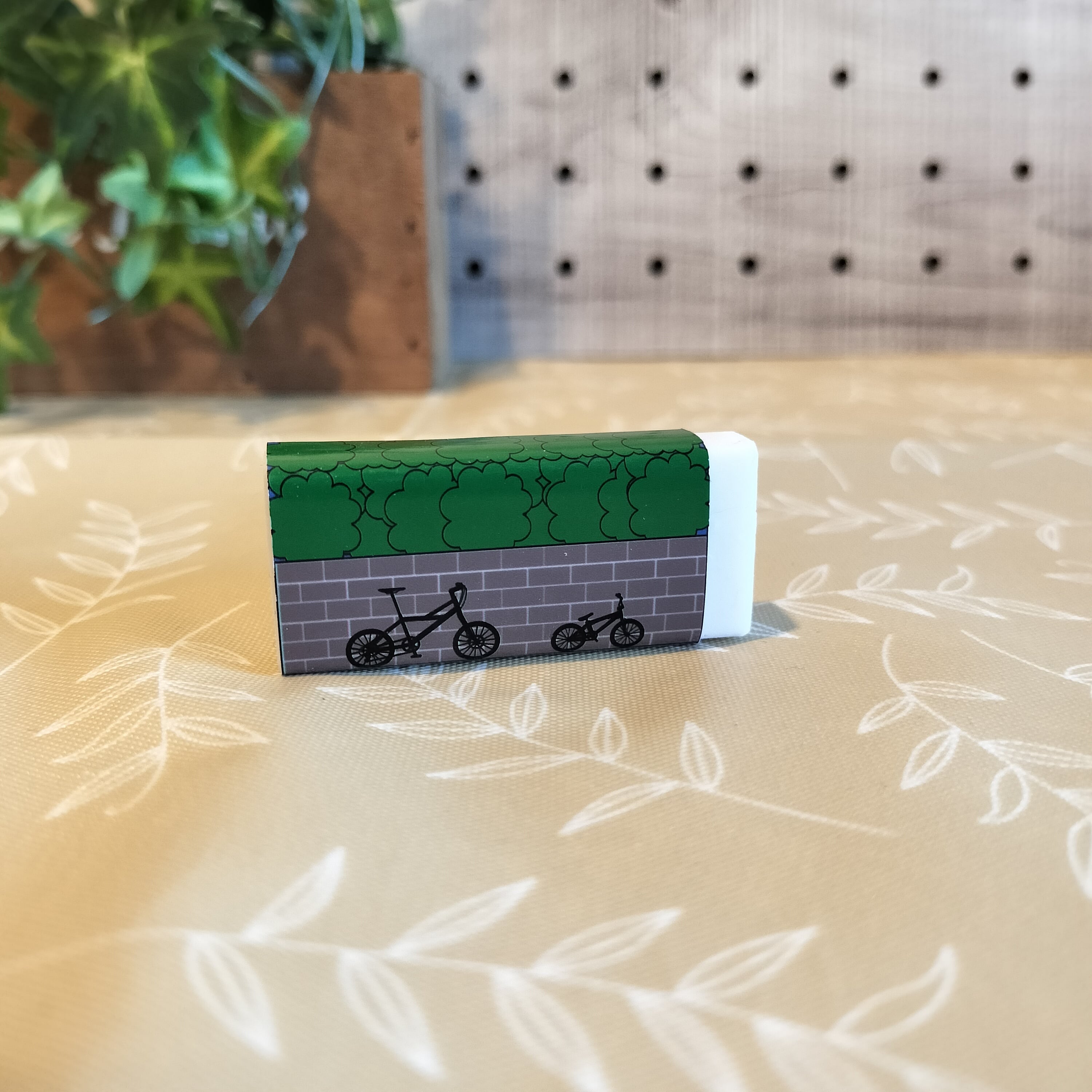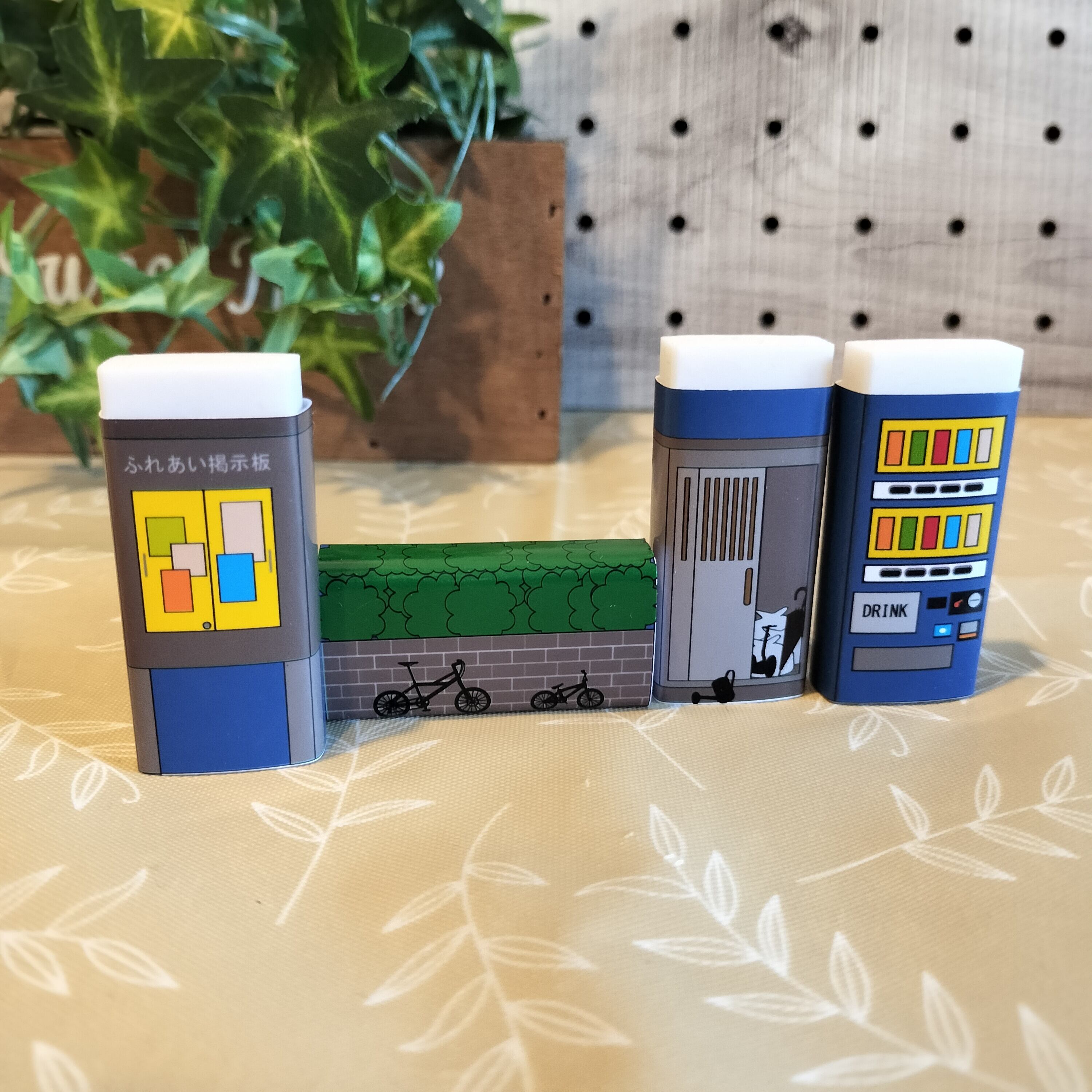 夜の街の風景をデザインしたイレイサー。よるまちイレーサー4個セット「一丁目の風景」。自動販売機、掲示板、生け垣、物置などが消しゴムのケースにデザインされています。